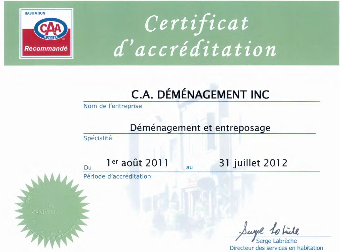 Cette entreprise est recommandée par CAA-Habitation et l'Association canadienne des déménageurs :
