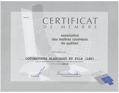 Cette entreprise est certifiée par la R.B.Q. ainsi que par l'Association canadienne des Entrepreneurs en Couverture, l'Association des Maîtres Couvreurs du Québec, de SOPREMA ainsi que de plusieurs Prix et Mentions pour la qualité de ses interventions